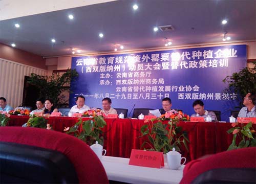 2011年8月29日至8月30日,由云南省商務(wù)廳主辦的省級教育規(guī)范替代種植企業(yè)動員大會,西雙版納州地區(qū)會議在景洪召開。會議主要總結(jié)了替代種植工作五年的工作成效、存在的問題,下一步的發(fā)展規(guī)劃,以及相關(guān)替代種植政策的學習。會議強調(diào),替代種植取得了很好的成效,五年來通過政府鼓勵,蓬勃發(fā)展。但存在的問題是各企業(yè)管理不到位,接下來的五年時間,政府會輔助企業(yè)完善和規(guī)范自身管理,加強企業(yè)本身在政策、管理、資金、人力各方面的實際能力,以更規(guī)范、更良好的形象,促成替代種植工作取得更大成績。